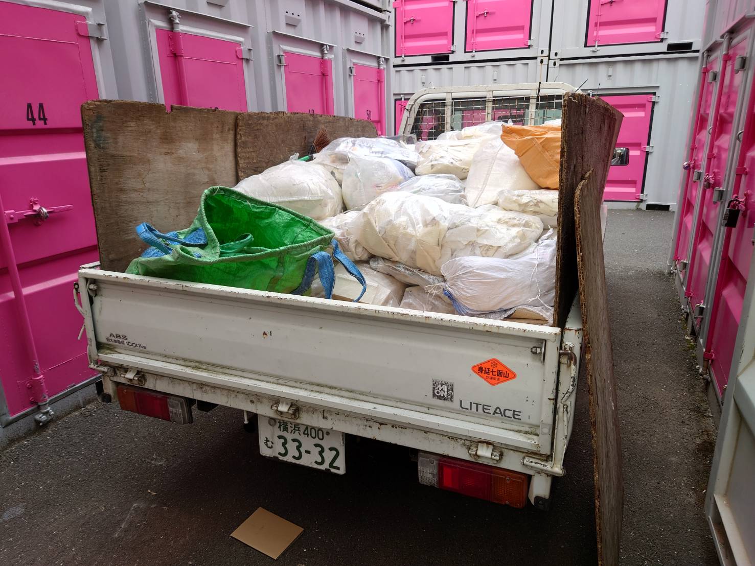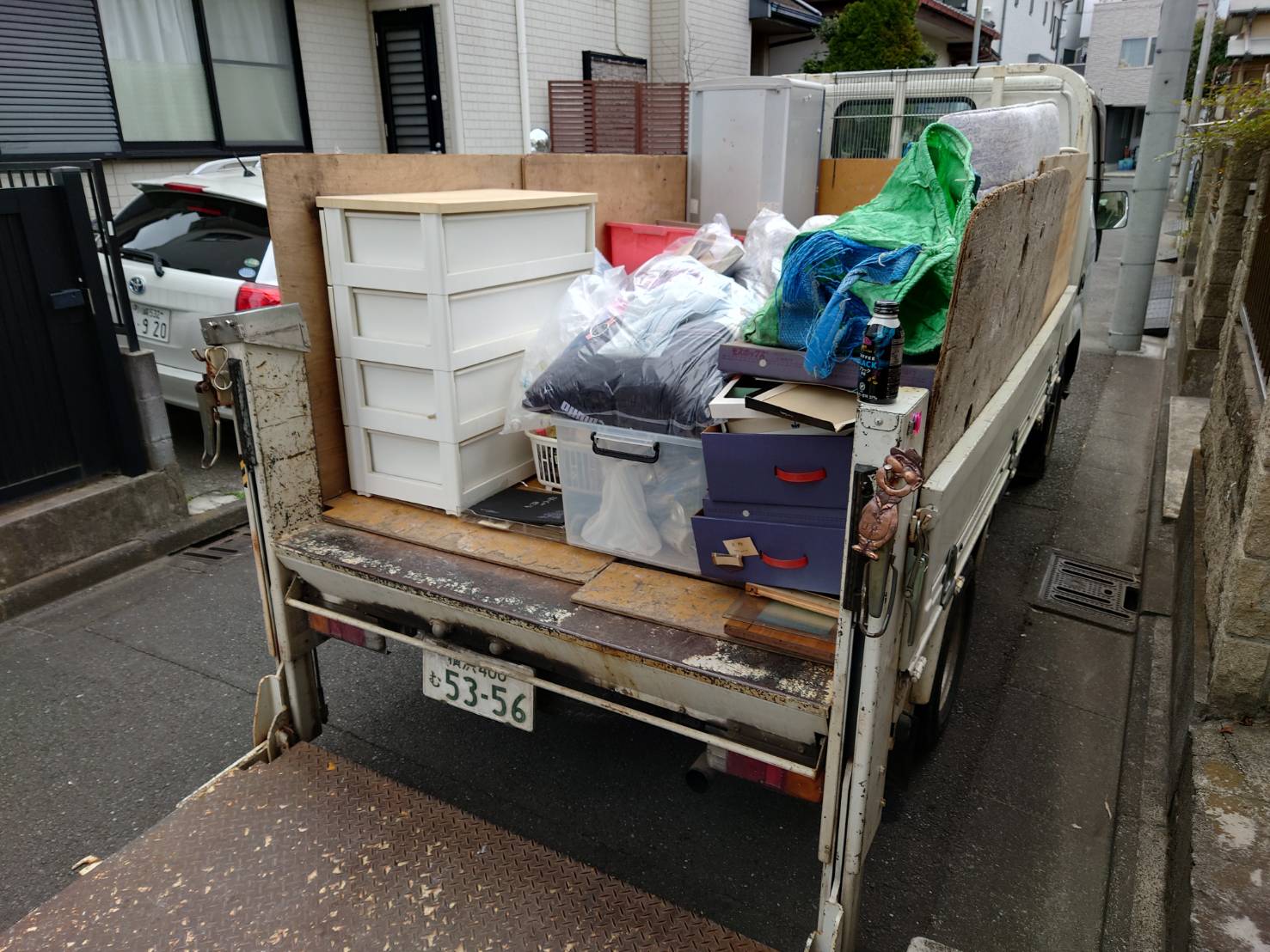 産業廃棄物と不用品を仕分けしトラックで回収しました。作業時間は二人で一時間位でした。